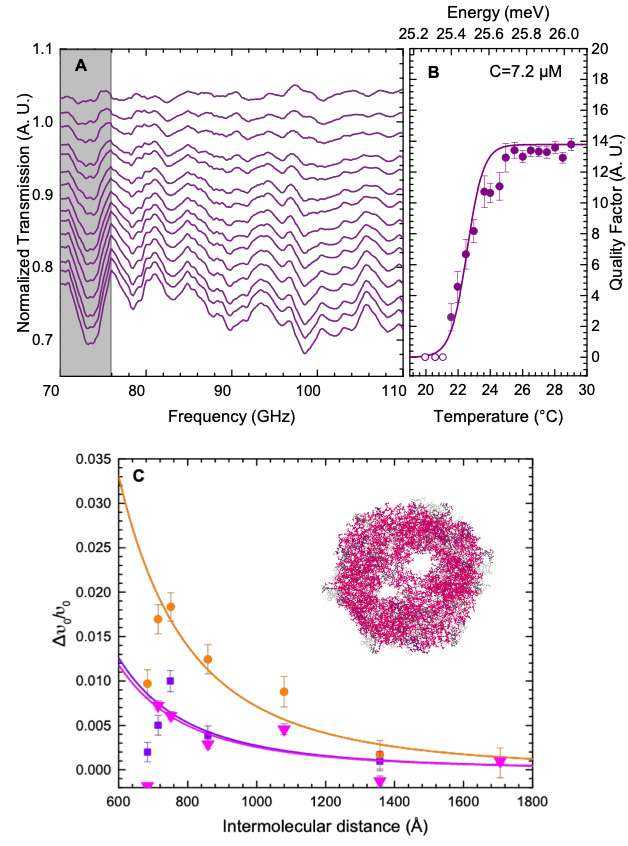 Proteins exhibit vibrational modes, known as normal modes. When the energy input exceeds a critical threshold (Figure (b)), a phase transition occurs: the energy is no longer evenly distributed among the modes but instead becomes concentrated in the lowest-frequency mode, at the expense of the others. This phenomenon, called phonon condensation, can under certain concentration and energy conditions give rise to long-range electrodynamic forces [Sci. Adv., adv0346 (2025); Sci. Adv., abl5855 (2022)].