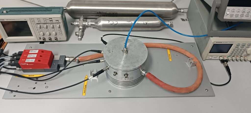 The test bench enables the creation of gas mixtures (Air, CO₂, CH₄: 10 to 5000 ppm) within a sealed chamber equipped with 8 leak-proof BNC outputs. A control and data acquisition system complements the test bench.