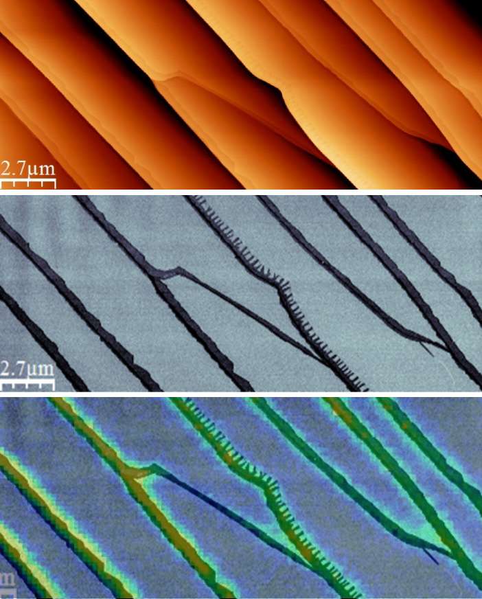 Graphene/SiC sample with µm-scale repositioning for multi-technique AFM and Raman analysis (from top to bottom: AFM topography, AFM phase, and superimposition of AFM and Raman mappings). Results obtained in collaboration with the SCBD team from the Nano axis [T. Wang https://theses.hal.science/tel-01946415v1]