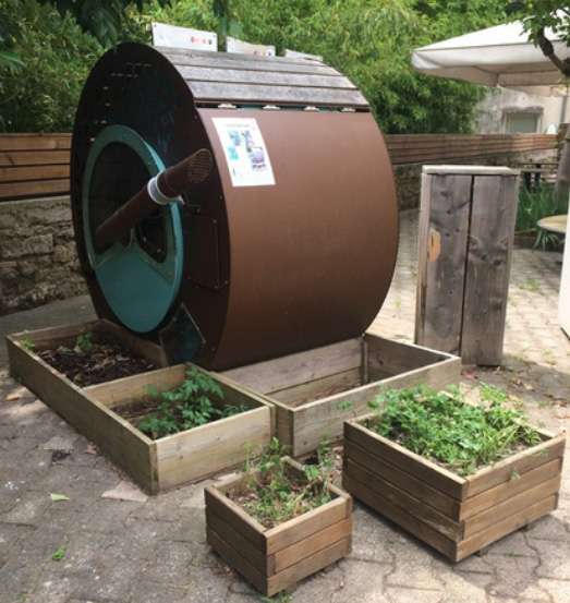 Instrumented composting fountain installed on the esplanade of the cafeteria at the Faculty of Education in Montpellier. This composting fountain is equipped to measure various parameters such as temperature, humidity, and gas concentration (CO₂, CH₄, N₂O) to study and optimize the carbon footprint of composting