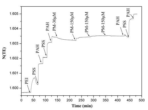 Changes of the effective refractive index of the transverse electric mode (NTE) upon buildup of PEI-(PSS-PAH)2-PM30- (PM150)x3-PAH-PSS-PAH polyelectrolyte multilayer; PM- purple membranes